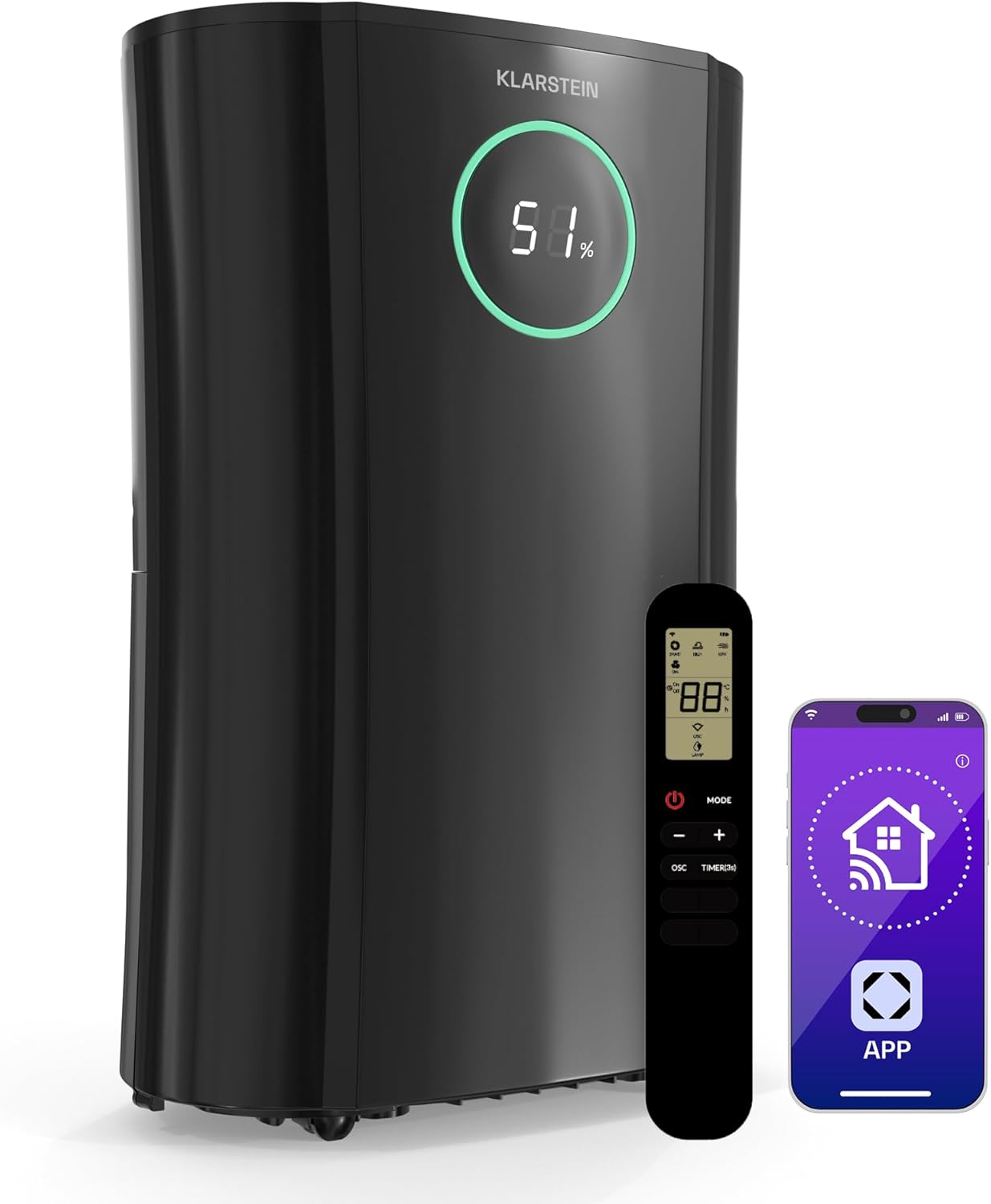 KLARSTEIN DryFy ProConnect 24L Déshumidificateur Smart, Wi-FI, 24h Minuterie, Filtre Charbon Actif, Silencieux, Réservoir 4L, Portable, pour Maison & Bureau, Jusqu'à 36m², Noir